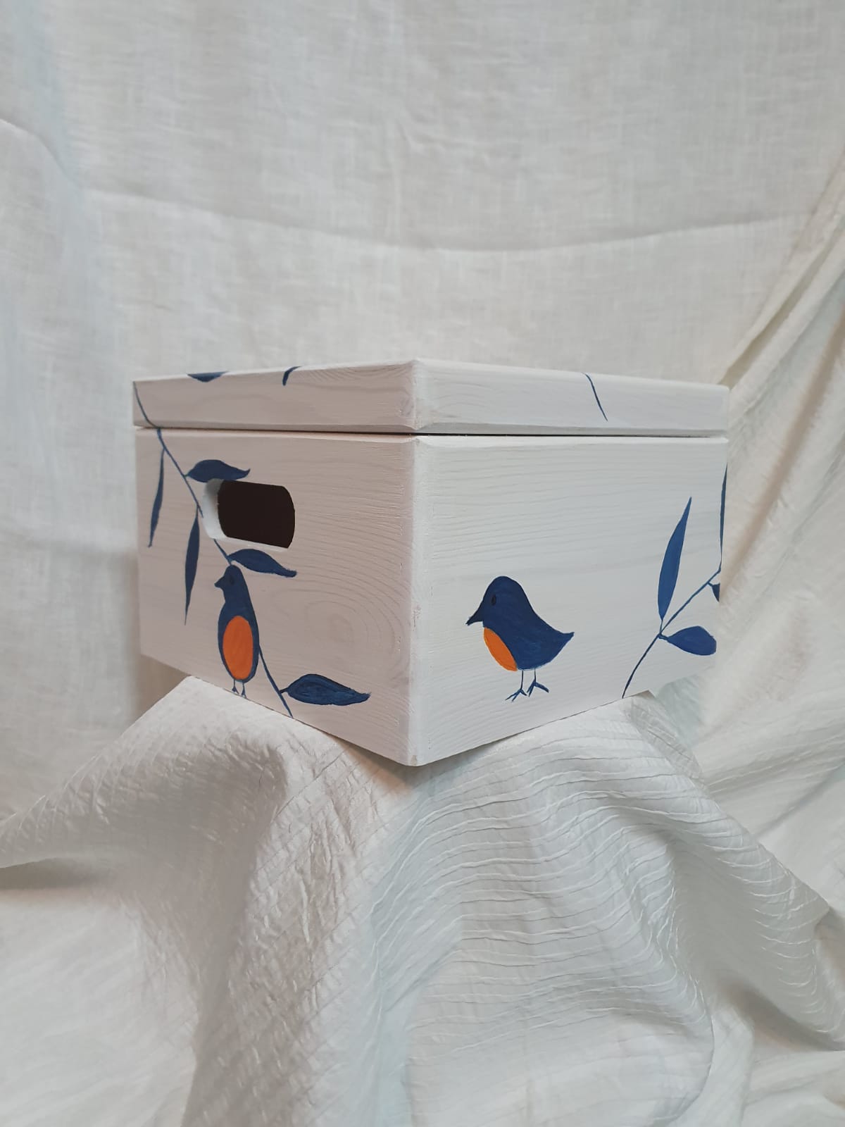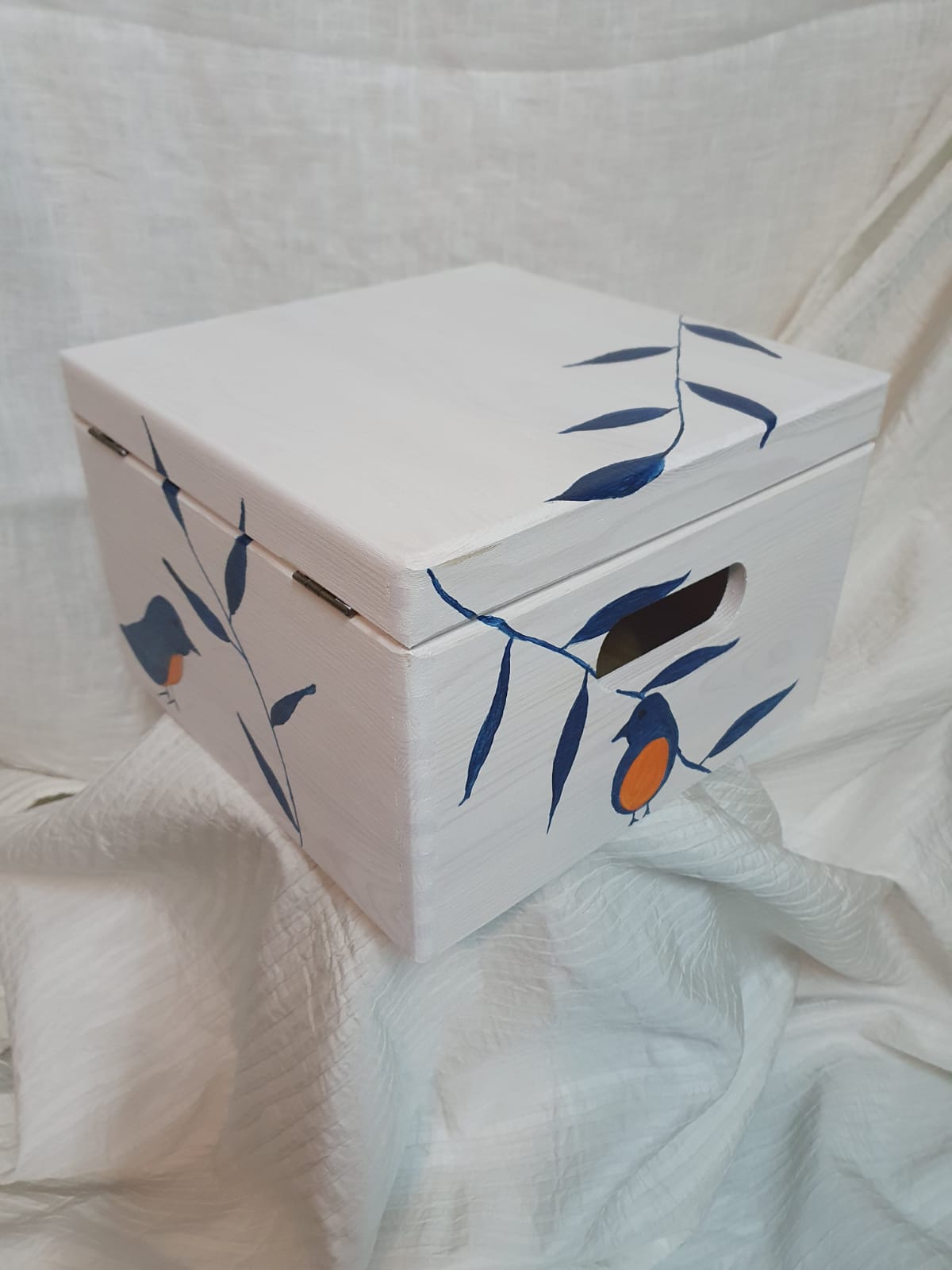 5. Persoonlijk Gedenkkistje (herinneringsdoos) – Handgemaakt – roodborstje blauw/oranje